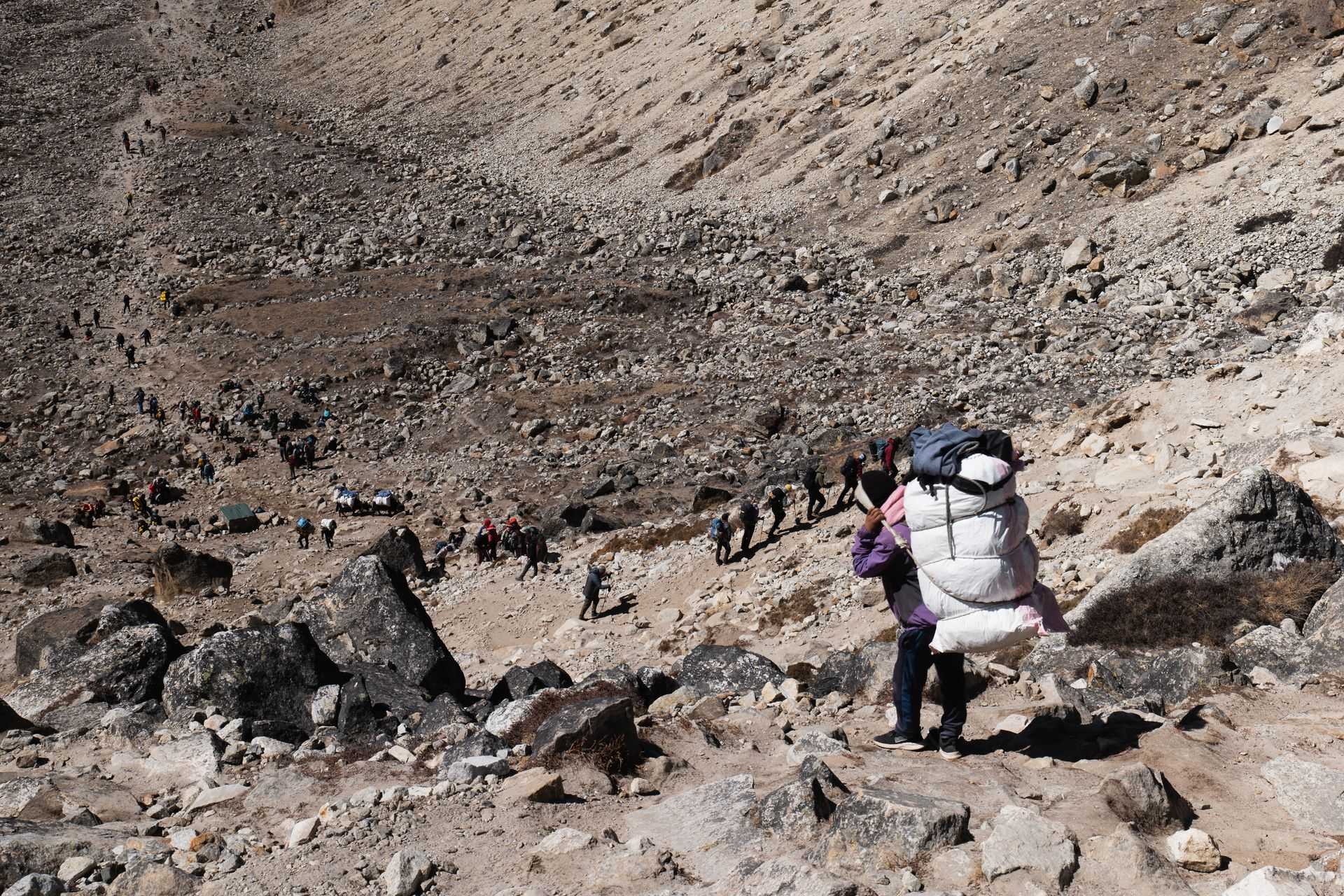 Dans le Khumbu, au Népal, il y a des forêts luxuriantes, des rhododendrons, des villages perchés, des yaks, des sommets écrasants, et mille choses encore dont j’ai rêvé longtemps. Ama Dablam, Nuptse, Lhotse, Everest, les sommets mythiques se découvrent peu à peu sous les lueurs bleues glaciales du matin. Des murs de glace qui attirent tous les regards, laissent rêveur le voyageur et défient les alpinistes chevronnés. Pourtant, la rêverie n’a plus sa place ici. Le Khumbu, terre d’aventure par nature, n’est plus qu’un terrain de jeu parfaitement décoré. À l’approche du toit du monde, les chemins s’embouteillent, les hélicos envahissent le ciel, et le calme de la montagne n’est plus qu’un souvenir égaré. Sur la route des sommets, ma tête s’engourdit, mon souffle raccourcit, et le regard vers les pics, au milieu de la foule, la solitude m’envahit.